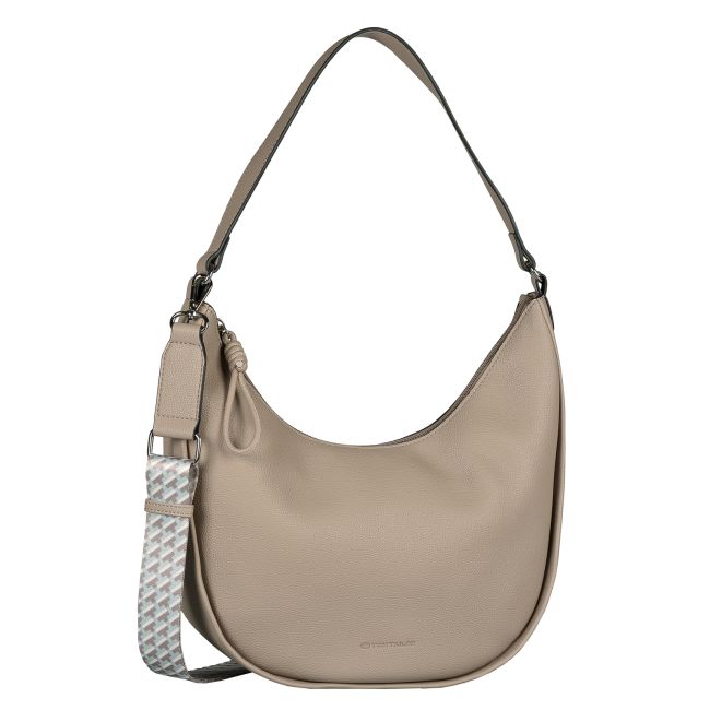 Tom Tailorin Tatiana on keskikokoinen taupenvärinen hobo-olkalaukku. Tilavaan olkalaukkuun mahtuu perustarpeiden kuten lompakon ja puhelimen lisäksi muutakin tavaraa kuten silmälasikotelo, kalenteri, meikkipussi tms.