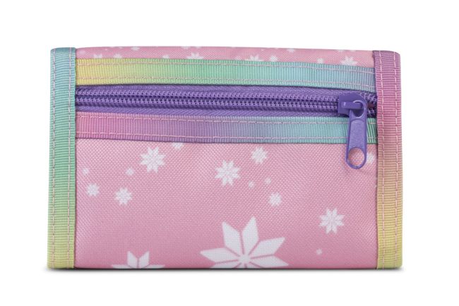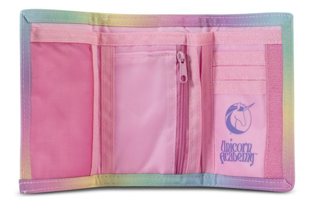 Ihastuttava lasten lompakko, jossa Unicorn Academyn lasten ja yksisarvisten kuvia. Tarrakiinnitteisessä lompakossa on paikat muutamalle kortille sekä käteiselle rahalle. Kolikoille ja muille pienille aarteille on kaksi vetoketjulla suljettavaa tilavaa taskua.