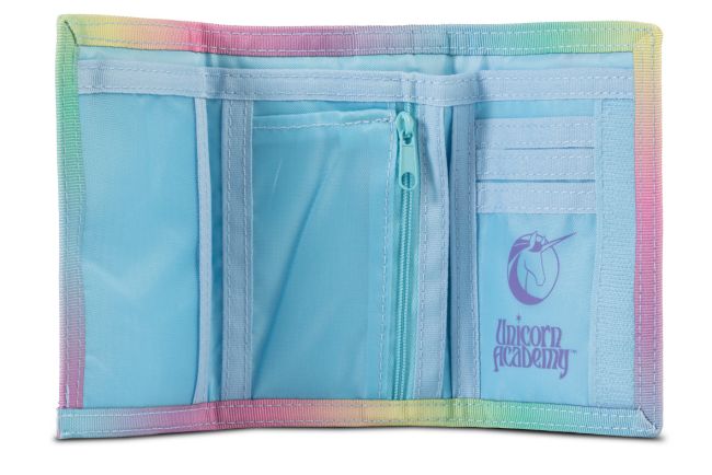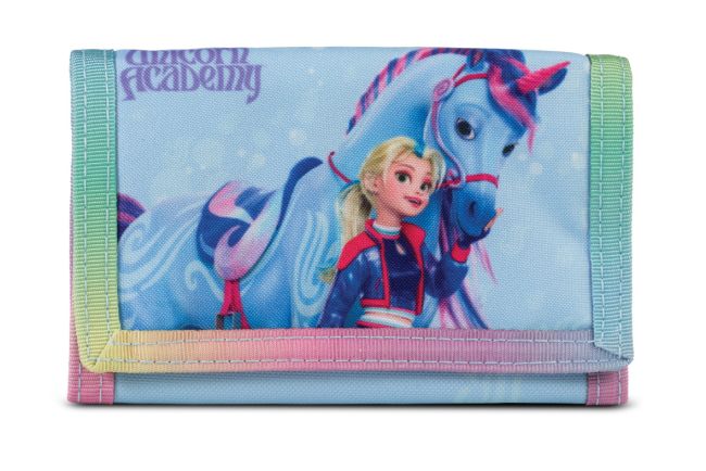 Ihastuttava lasten lompakko, jossa Unicorn Academyn lasten ja yksisarvisten kuvia. Tarrakiinnitteisessä lompakossa on paikat muutamalle kortille sekä käteiselle rahalle. Kolikoille ja muille pienille aarteille on kaksi vetoketjulla suljettavaa tilavaa taskua.