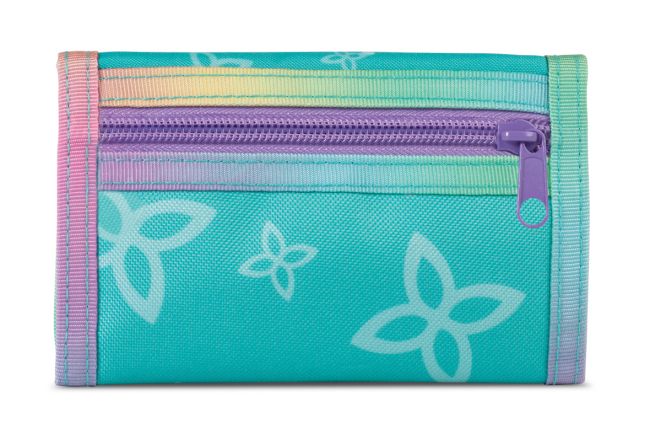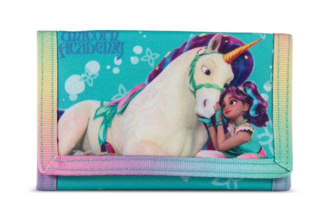 Ihastuttava lasten lompakko, jossa Unicorn Academyn lasten ja yksisarvisten kuvia. Tarrakiinnitteisessä lompakossa on paikat muutamalle kortille sekä käteiselle rahalle. Kolikoille ja muille pienille aarteille on kaksi vetoketjulla suljettavaa tilavaa taskua.