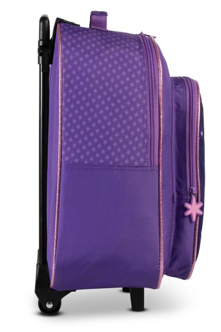 Lasten upea Unicorn Academy -teemainen violetti matkalaukku. Kankaisessa matkalaukussa on kaksi pyörää, vetoaisa ja kantokahva. Laukkuun saa kätevästi pakattua lapsen omat tavarat niin kotimaan reissuille kuin lentokoneeseen käsimatkatavaraksi. Kevyttä matkalaukkua on lapsen helppo vetää itse perässään tai aikuisen kantaa kantokahvasta.