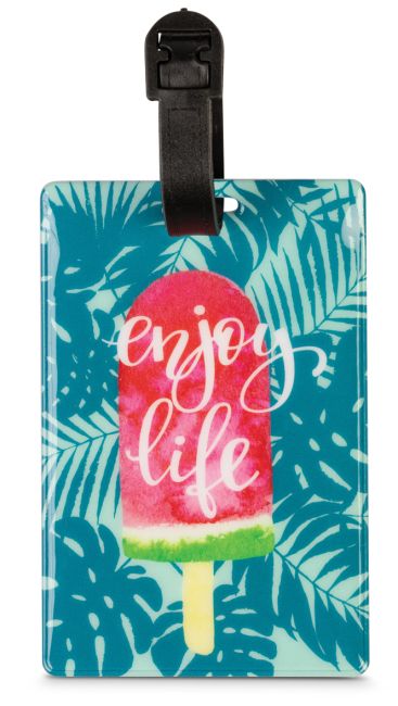 Worldpackin suurikokoinen "Enjoy life" -nimilappu auttaa sinua tunnistamaan oman matkalaukkusi tai reppusi muiden joukosta. Nimilapun takana on ikkunallinen tasku, jonka irrotettavaan yhteystietolappuun saat kirjoitettua nimesi ja yhteystietosi.